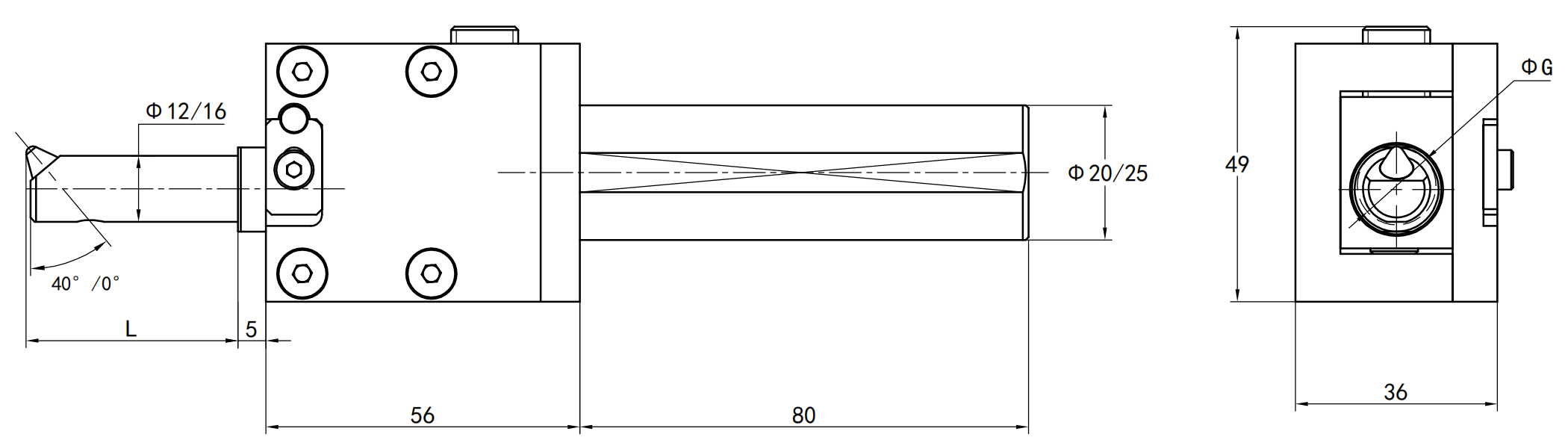 | 工具型號(hào) | 角度 | 鏜刀桿尺寸 | 最小加工孔徑 | 安裝柄徑 |
